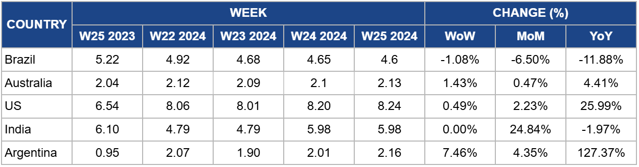 In W25, the wholesale price of boneless rear beef in Brazil averaged USD 4.60 per kilogram (kg). This marks a 1.08% week-on-week (WoW) drop, a 6.50% month-on-month (MoM) decrease, and a 11.88% YoY decline. The price in Brazilian real (BRL) remained steady at BRL 25.00/kg, indicating that the WoW drop in USD is due to the devaluation of the real against the US dollar. However, the YoY decline is primarily due to a high beef supply in the Brazilian market resulting from increased production. The Center for Advanced Studies on Applied Economics (CEPEA) reports that approximately 613.54 thousand metric tons (mt) of meat were available at national wholesale in May-24, an increase of 11.6% compared to Apr-24. CEPEA also indicates that domestic beef availability reached 2.972 million metric tons (mmt) from Jan-24 to May-24, the highest volume since 2018. This surge is attributed to lower cattle prices in 2024, reflecting a demand that has not kept up with the increase in supply.