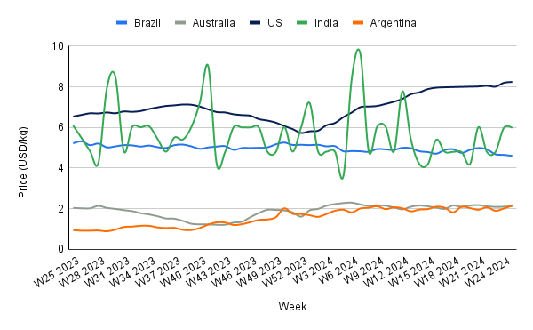 In W25, the average price of beef (cow) in India was USD 5.98/kg, a 1.97% YoY decline. However, this price represents a significant 25.10% MoM increase, highlighting the volatility of the Indian beef market, which has been pronounced over the past year. This volatility is mainly driven by fluctuations resulting from both domestic and international regulations.