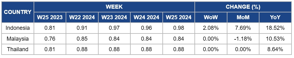 In W25, palm oil prices in Thailand remained unchanged at USD 0.88/kg, maintaining stability since W22. Thailand launched a Sustainable and Climate-Friendly Palm Oil Production and Procurement (SCPOPP) project to enhance the sustainability of palm oil production and support farmers in the sustainable management of oil palm plantations. It also seeks to promote knowledge transfer and increase the competitiveness of Thai farmers in the global market.