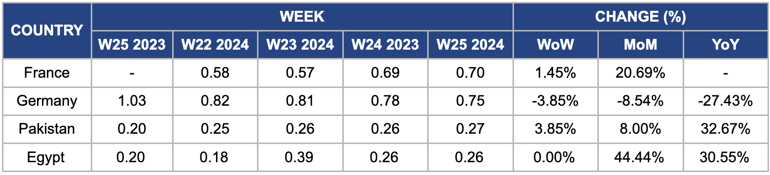 In W25, Germany's wholesale potato prices declined by 3.85% WoW to USD 0.75/kg from USD 0.78/kg. Compared to the same period last year, prices were down by 27.43%. This price decrease was due to the scarcity of early potatoes in 2024. Farmers in Germany faced challenges in planting due to heavy rainfall in Feb-24 and early Mar-24, mainly affecting southern and southwestern regions. The excessive rain hindered field access and delayed starch storage, complicating the harvest process.