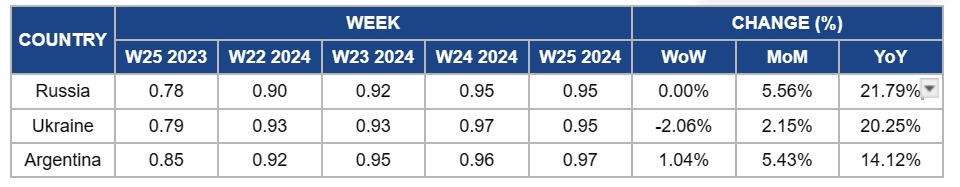 In W25 in the sunflower oil landscape, India's overall edible oil imports decreased by 5% YoY in the first seven months of the 2023/24 season, while sunflower oil imports saw a significant 20% YoY growth due to reduced import duties. Ukraine’s sunflower oil prices rose by 2.5% WoW and 10.8% MoM due to reduced supply and increased demand from India and the EU. In MY 2024/25, global sunflower supply is expected to decrease, with mixed regional harvests. The EU projects a slight increase in crop yield, while Russia and Ukraine anticipate declines in sunflower harvests. Sunflower oil prices in Russia remained unchanged this week. The price in Ukraine decreased by 2.06% WoW.
