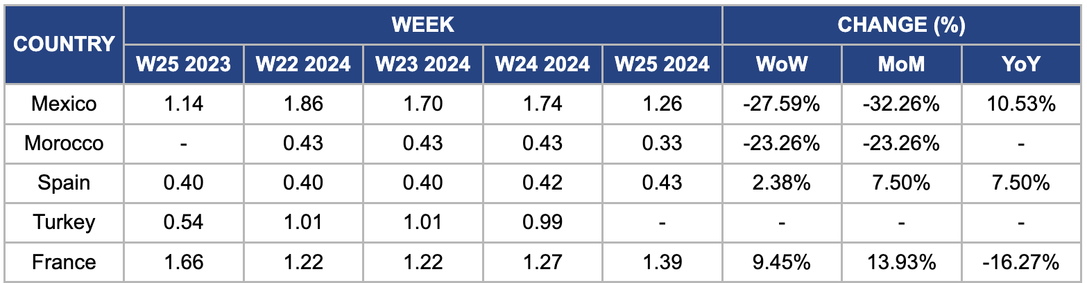 In France, tomato prices surged 9.45% WoW to USD 1.39/kg in W25. This increase follows a trend of rising prices since W22. As the production cycle concluded,the market faced insufficient supply compared to demand and crops were uprooted in preparation for the next season. According to a producer and exporter, this supply shortage is the primary factor driving the price increase in the tomato market.