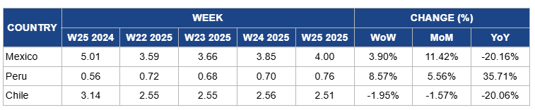 In W25, avocado prices in Mexico increased by 3.90% week-on-week (WoW) to USD 4/kg, reflecting an 11.42% month-on-month (MoM) increase due to tighter supplies linked to the seasonal decline in harvesting volumes and increased local demand. However, year-on-year (YoY) prices dropped by 20.16% due to significantly higher production levels earlier in the year, which had pushed prices down in 2024 compared to the same period in 2023, when supply was more limited and export demand was stronger.