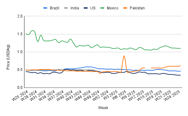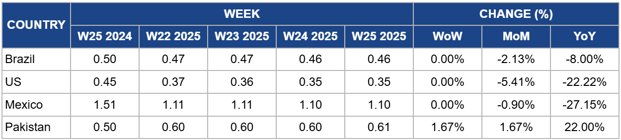 In W25, Pakistan's sugar prices rose to USD 0.61/kg, 1.67% higher WoW and MoM, amid sharp domestic supply concerns. Despite exporting 765,734 mt of sugar in the current fiscal year (FY), a 2,200% YoY increase, the government has now approved the import of 750,000 mt to counter surging local prices, which reached a record USD 0.68/kg (PKR 190/kg). This reversal has drawn criticism for benefiting sugar millers at the expense of consumers, especially as the move contradicts recent free-market policy commitments.