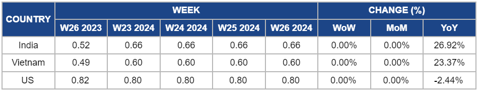 In W26, Vietnamese rice prices held steady at USD 0.60/kg, unchanged from the previous week but reflecting a significant 23.37% YoY increase. This is due to projections of a 1.4% YoY decrease in Vietnam's rice output for the 2023/24 crop year, totaling 27.8 mmt. According to the FAO, rice exporters in Southeast Asia, including Vietnam, are expected to face challenges in 2024. Despite this, Vietnam's rice harvest and yield increased in the first six months of 2024, leading to increased exports in both volume and value due to high prices. The Ministry of Agriculture and Rural Development reported that Vietnam harvested crops on 3.48 million ha of paddy fields, a growth of 0.5% YoY, with an average yield of 67.1 mt/ha, up 0.7 mt/ha. The total rice output was 23.3 mmt, up 1.6% YoY. In the first half of the year, Vietnam exported 4.68 mmt of rice, earning USD 2.98 billion, with a 10.4% YoY increase in volume and a 32% surge in value due to high export prices.