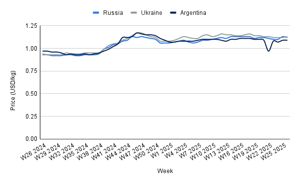 In W26, Argentina’s sunflower oil prices remained stable at USD 1.09/kg, showing no weekly change but rising 12.37% YoY due to increased supply following harvest. However, while demand remains subdued amid global economic uncertainties, overall availability is constrained by reduced processing capacity, partly due to delays from a major crusher shutdown. Elevated YoY prices reflect persistent structural challenges such as high logistics and input costs, and past weather disruptions. The 2024/25 sunflower campaign set production records at 4.7 mmt, supported by crop expansion into new regions and technological improvements. Historic crushing volumes and strong export demand, particularly from India, underpin a positive outlook, although a significant yield gap suggests further growth potential that could influence future price dynamics.