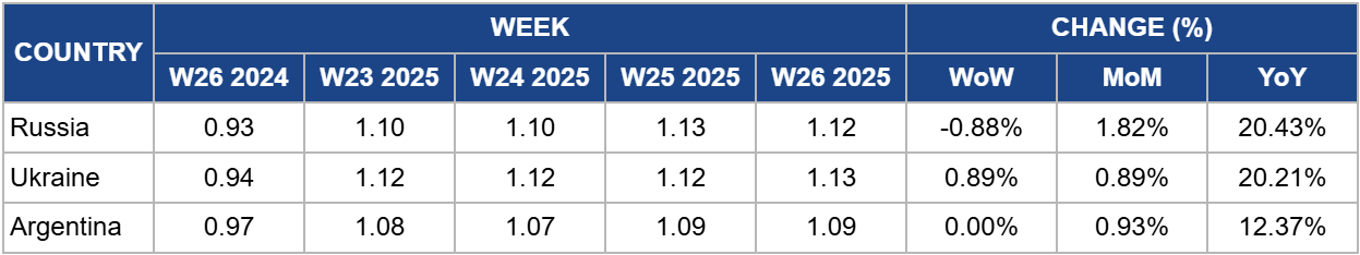 In W26, Russia's sunflower oil prices declined slightly by 0.88% week-on-week (WoW) to USD 1.12 per kilogram (kg) but remained 20.43% higher year-on-year (YoY), reflecting lingering supply constraints from earlier in the season. The recent easing in prices is attributed to improved supply conditions as sowing progress reached 91% with expanded acreage. However, prices continue to be supported by earlier weather-related disruptions and sustained export demand from Southeast Asia. Although the government halved export duties (USD 60.18/mt) in Apr-25, a concurrent rise in the reference price tempered the intended effect. The upcoming further reduction in export duties in Jul-25 may enhance international competitiveness and exert additional downward pressure on prices in the medium term.