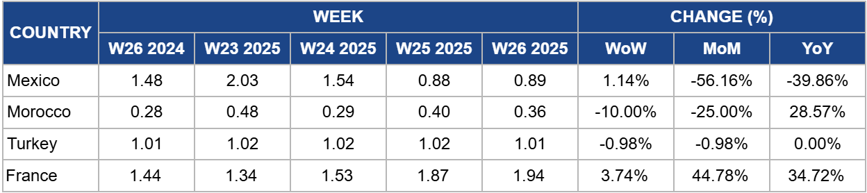 In W26, France’s tomato price rose to USD 1.94/kg in W26, marking a 3.74% increase WoW, a 44.78% increase MoM, and a 34.72% rise YoY. These sharp comparative gains are largely due to supply constraints, including a 2% YoY decline in national production, driven by acreage reductions and adverse weather in southern regions. While demand for larger-caliber tomatoes remains strong in the domestic market, producers of smaller tomatoes continue to face pricing pressure from lower-cost Moroccan imports.