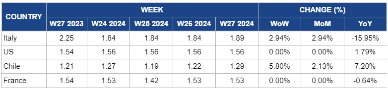 In France, apple prices have remained steady at USD 1.53/kg in W27 since W26 after a decrease in W25. This stability comes after a 7.69% WoW increase in W26, reflecting temporary market adjustments due to renewed demand and improved supply conditions. Despite the off-season in July, consistent domestic demand has helped maintain steady prices.