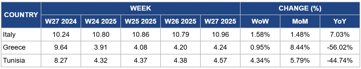 In Tunisia, extra virgin olive oil prices are up 4.34% WoW and have risen 5.79% over the past month, bringing the price to USD 4.57/kg in W27. Despite the recent price rise, Tunisian olive oil prices are still down 44.74% compared to the same week last year. The short term price rise is driven by weather concerns coupled with strong export demand. Like the rest of the Mediterranean, Tunisia is being affected by the Jul-25 heatwave. This is creating significant uncertainty for the upcoming 2025/26 harvest, as extreme heat can negatively impact fruit development and final yields. This weather risk is being priced into the current market. Furthermore, Tunisia has had a successful export season, capitalizing on the production shortages in other key regions. As the season concludes, the remaining stocks are being met with firm demand, pushing prices higher for the available volumes. However, the massive production rebound in the 2024/25 season put significant downward pressure on prices throughout 2025 resulting in the significantly lower YoY price.