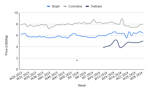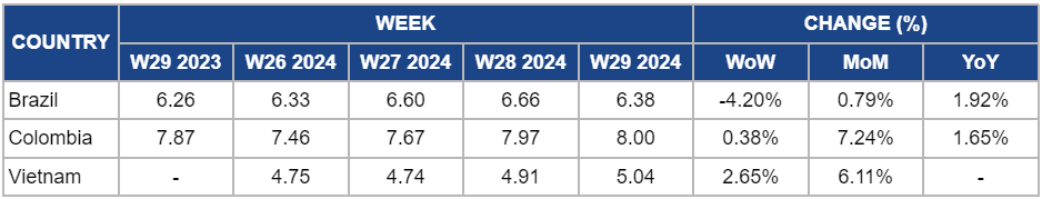 Vietnam's robusta coffee prices increased to USD 5.04/kg in W29, marking a 2.65% WoW increase and a 6.11% monthly rise from 4.75/kg in W26. Vietnam's coffee exports are forecasted to remain limited until the end of the year due to drought conditions affecting production and the potential onset of La Niña, which could bring increased rainfall and further disrupt exports. Industry experts do not foresee a recovery in export volumes until Dec-24 at the earliest. This tight supply situation may exert upward pressure on global coffee prices, particularly for robusta beans, of which Vietnam is a significant producer.