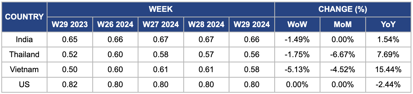 In W29, Vietnamese regular rice prices decreased by 5.13% WoW to USD 0.58/kg from USD 0.61/kg in W28. This decline is due to increased harvests and yields in the first half of 2024, which boosted export volume and value. Vietnam’s Ministry of Agriculture and Rural Development reported a 0.5% YoY increase in cultivated paddy fields to 3.48 million ha, with an average yield of 67.1 mt/ha, up by 0.7 mt/ha. Despite the WoW price drop, prices have increased by 15.44% YoY. This price trend aligns with a global downward movement influenced by potential changes in India’s rice export policies, which may lower Asian rice prices. However, global demand remains robust, with opportunities emerging as Indonesia’s rice imports are expected to rise. The Philippines may cut rice import taxes, offering the potential for Vietnamese businesses to secure favorable prices and mitigate risks.