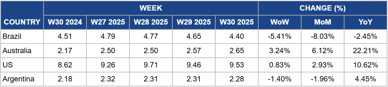 In W30, Brazil’s wholesale price for boneless rear beef declined by 5.41% week-on-week (WoW) to USD 4.40 per kilogram (kg), reflecting an 8.06% MoM drop and a 2.45% YoY decrease. According to Safras and Mercado, the wholesale market signals a continued short-term downward trend, driven by slower restocking between wholesale and retail channels in the latter half of Jul-25. Chicken meat continues to be price-competitive compared to beef and pork, further weighing on beef demand. In the physical cattle market, slaughter volumes remain steady due to adequate supply and strong inflows of confined cattle. Meanwhile, the outlook for Brazilian beef exports to the US remains bleak, as the recent tariff hike has rendered shipments economically unviable. However, the domestic market is expected to see a modest recovery in early Aug-25, with beef prices likely to firm ahead of Father’s Day, a key driver of seasonal consumption.