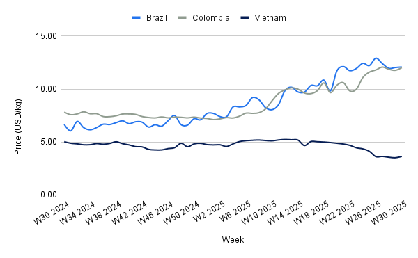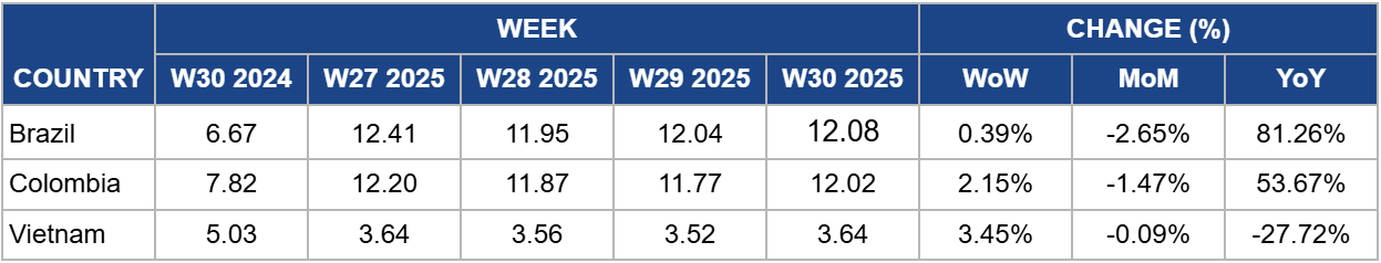 Colombian coffee prices maintained a resilient tone in W30 at USD 12.02/kg, demonstrating a 2.15% WoW increase. This stability is supported by tight supply as the planting season begins and internal stocks are drawn down. Though falling margins in international premiums have dampened enthusiasm, the depreciating Colombian peso is helping underpin exporter returns.