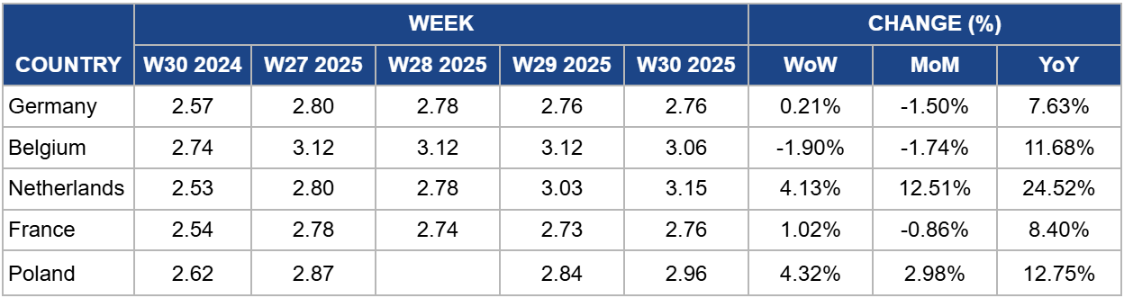 In Germany, the price of SMP was USD 2.76/kg in W30, a slight increase of 0.21% week-on-week (WoW). This price represents a 1.5% decrease month-on-month (MoM) but remains up a significant 7.63% year-on-year (YoY). The German SMP market appears to be stabilizing after recent volatility, with prices firming up slightly this week. The minor WoW increase suggests that the market has absorbed the peak of the seasonal milk flush and is now reacting to the underlying tightness in the EU's raw milk supply.