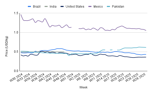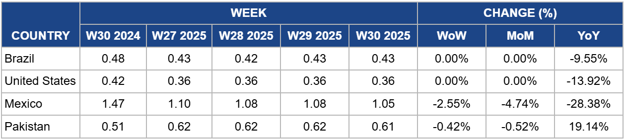 In W30, Mexican wholesale sugar prices remained relatively stable at USD 1.05/kg, a slight 2.55% WoW decrease and 4.74% MoM drop, showing stability despite broader global fluctuation. YoY prices continue to exhibit significant downward pressure, down 28.38%. Domestic mills continue recovering output, aligned with improving weather and cane yield, but export activity remains limited and shows no pricing impact yet.