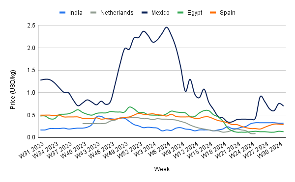 In W31, Mexican wholesale onion prices fell 7.89% WoW and 45.31% YoY to USD 0.70/kg, reversing previous increases. This drop occurred despite severe weather disruptions, including Hurricane Hilary in late Aug-23, which destroyed a significant portion of the early Mexican onion crop. Initially, this led to higher prices due to the reduced local supply and increased import dependency. However, prices started to decrease as the market adjusted and imported onions began to fill the supply gap. The high production costs and tight supply situation caused by the weather initially pushed prices up. Still, the influx of imported onions helped stabilize prices as supply conditions improved.
