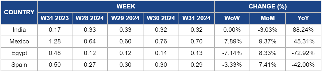 In W31, onion prices in India remained unchanged WoW. This price stability follows the government's procurement of nearly 71 thousand mt of onions as of Jul-24 for buffer stock, out of a target of 500 thousand mt for price stabilization. The government expects retail prices to ease with the progress of the monsoon over most parts of the country. This move comes as prices of vegetables, including onions, surged 88.24% YoY due to adverse weather conditions. In Karnataka, the top Kharif onion-producing state, 30% of the targeted 150 thousand hectares (ha) has been sown, with good progress in other primary states. Despite marginally lower Rabi production in 2024/25, the domestic onion market remains stable due to higher releases from the rabi harvest.