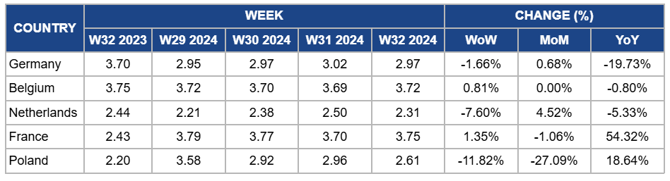 In Poland, skimmed milk powder prices decreased by 11.82% WoW to USD 2.61/kg in W32. The monthly price change was more significant, dropping by 27.09% MoM from USD 3.58/kg in W29, reflecting a weak powder market due to low demand. Poland’s milk powder exports declined due to decreasing demand from China, negatively affecting local production and prices. Consequently, many milk processing factories in Poland are cutting milk powder production to avoid losses.