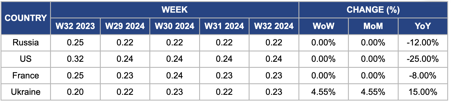 United States (US) wheat prices remained stable at USD 0.24/kg in W32 but fell 25% YoY from USD 0.32/kg in W32 2023. This decline is due to the positive outlook for US wheat production, spurred by dry conditions that have advanced the harvest. US wheat exports have significantly increased since the start of the agricultural season, with contracts for 8.5 mmt established between June 1 and August 1, a 33% YoY rise. So far, 3.4 mmt have been shipped, primarily to Mexico and other Asian and Oceania countries. The USDA projects total wheat exports for the season to reach 22.5 mmt, a 17% increase from the previous season but slightly below the five-year average.