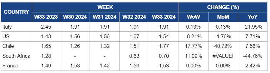 Apple prices in South Africa increased by 11.09% WoW to USD 0.70/kg in W33. This surge is due to the recent storm, which caused significant damage to apple orchards, reducing yields and disrupting the supply chain. The storm's impact on production and distribution has tightened the market, leading to higher prices. However, there is a 44.76% YoY price decline. The current YoY decrease reflects the contrast between last year’s high prices and the current lower prices resulting from the storm's impact on supply and the previous year’s market conditions.