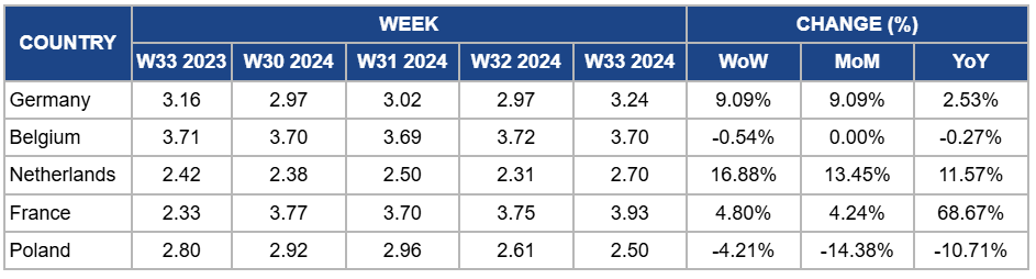 Germany’s powdered milk prices increased by 9.09% week-on-week (WoW) to USD 3.24/kg in W33 2024. Prices also observed a similar trend, rising 9.09% month-on-month (MoM) from USD 2.97/kg in W30 2024 and 2.53% YoY from USD 3.16/kg in W33 2023. Germany’s milk prices have been on an upward trend since the middle of 2023 due to increasing production costs and heat stress. In addition, the high fat and protein content has increased the value of raw milk price, further contributing to this increase.