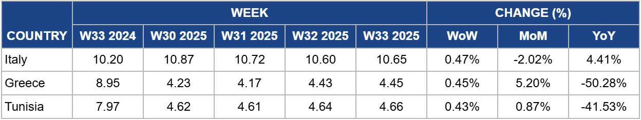 In Tunisia, the price of extra virgin olive oil was USD 4.66/kg in W33, an increase of 0.43% WoW. This contributes to a 0.87% MoM rise, but the price remains down a significant 41.53% YoY. The Tunisian olive oil market continues to firm up as the season concludes, driven almost entirely by scarcity. The steady WoW and MoM price increases are a direct result of domestic stocks being nearly depleted. With very little oil left to trade and quality concerns rising due to the summer heat, buyers are competing for the last available volumes, pushing prices higher. However, the massive 41.53% YoY price collapse remains the prevailing long-term trend. This reflects the significant market correction following the excellent 2024/25 harvest, which ended the supply crisis and record-high prices of the previous year.
