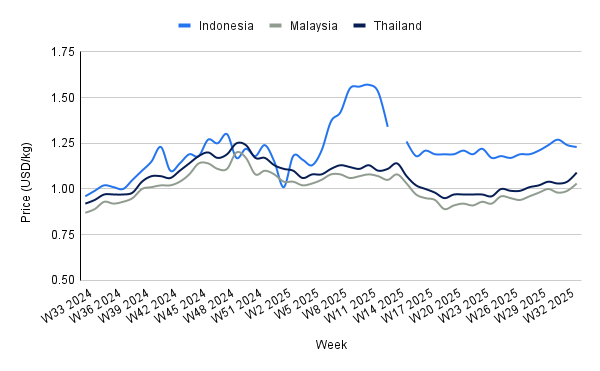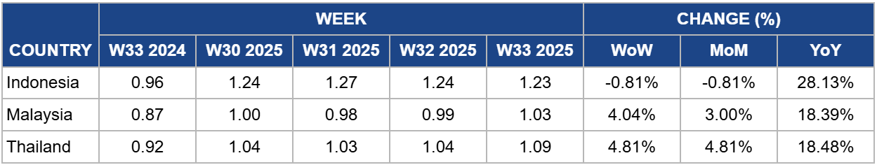 Malaysia's palm oil prices increased in W33, rising 4.04% WoW to USD 1.03/kg and 18.39% YoY, supported by gains in futures, with the three-month benchmark at USD 1034.92/mt (MYR 4,372/mt) and FOB Malaysia for Aug-25 delivery reaching USD 1,062/mt, the highest so far this year. However, analysts note that rising stockpiles, which hit a 19-month high of 2.11 mmt in Jul-25, alongside continued production growth expected to peak in Sep-25 to Oct-25, could cap further upside in the near term. Price support may re-emerge later in Q4-2025 as Indian festive demand strengthens and output slows with the monsoon, while elevated soybean oil prices keep palm oil competitive in global markets.