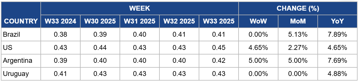 In W33, Argentina’s soybean prices experienced a strong 5% increase WoW, reaching USD 0.42/kg. This also represents a 5% MoM and 7.69% YoY gain. The sharp weekly increase is a direct result of new government incentives, including a favorable exchange rate and government tax cut on exports, which have boosted the competitiveness of Argentine soybeans on the global market and stimulated strong buying interest. The Argentine president announced a permanent reduction in the tax rate for soybeans and their by-products, a critical move as exports had been paralyzed since a temporary tax break expired on July 1. This announcement has already boosted futures prices for the upcoming 2025/26 crop. The lower tax is expected to incentivize farmer sales and stimulate planting intentions for the next season, aiming to improve the crop's profitability, which had been declining and causing some farmers to shift acreage to corn.