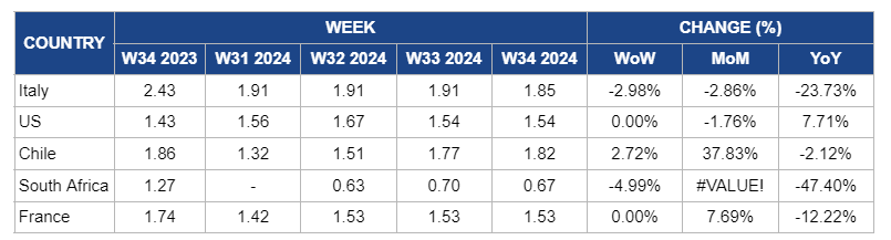 In Italy, apple prices in W34 decreased by 2.98% week-on-week (WoW) to USD 1.85/kg, with a 2.86% month-on-month (MoM) and a 23.73% YoY decline. Despite the severe drought and heatwave conditions affecting production, this price drop may result from a temporary market adjustment. Traders and distributors might be lowering prices in the short term, anticipating the eventual impact of reduced supply in the coming weeks. As the effects of the poor harvest become more apparent, prices are likely to experience upward pressure.