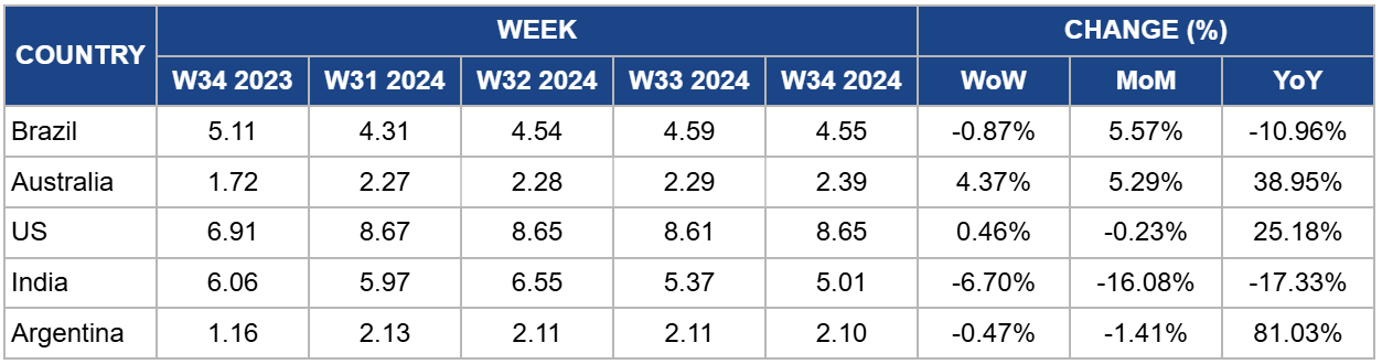 In W34, the wholesale price of boneless rear beef in Brazil averaged USD 4.55/kg, a 0.87% week-on-week (WoW) decrease and a 10.96% YoY decline. The WoW drop can be attributed to low demand and high supply in the market, as Safras and Mercado noted that the second half of Aug-24 saw reduced consumption. The YoY decrease is due to increased supply resulting from higher beef production. According to the latest USDA data, Brazil's beef production is expected to reach 11.35 mmt in 2024, marking a 3.65% increase compared to the previous year.