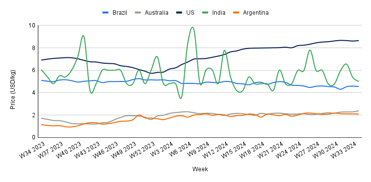 The average price of cow beef in India dropped to USD 5.01/kg in W34, reflecting a 0.47% WoW decrease and a 17.33% YoY decline. These price reductions highlight the ongoing volatility in the Indian beef market, which has been especially pronounced over the past year. This instability is primarily driven by a combination of domestic and international regulations and fluctuations in supply within the Indian market.