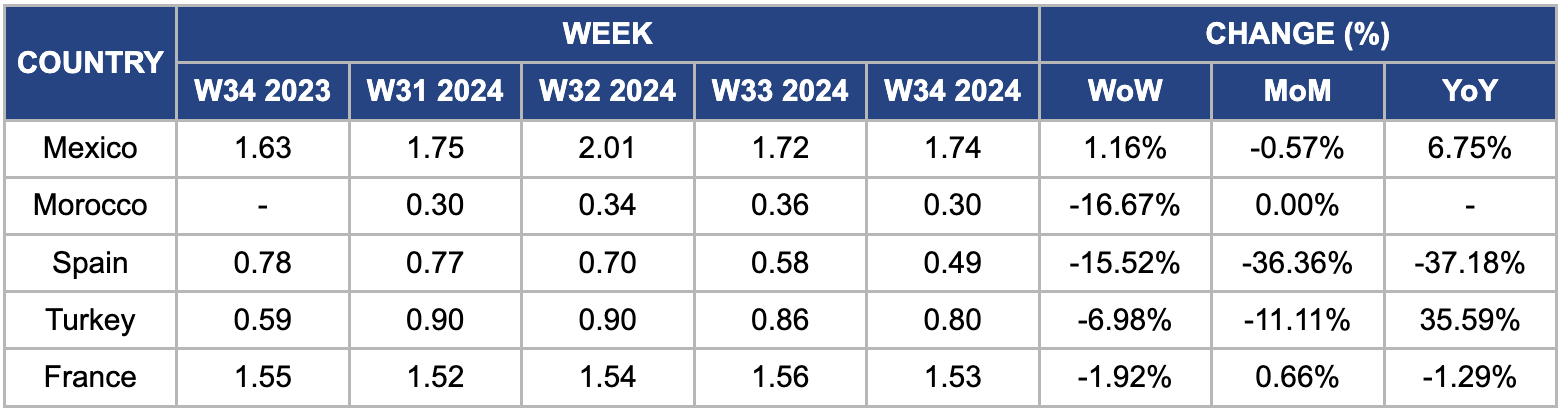 In W34, wholesale tomato prices in Mexico slightly increased by1.16% week-on-week (WoW), rising from USD 1.72/kg to USD 1.74/kg. Mexican tomato prices remain the highest among other suppliers, including Morocco, Turkey, Spain, and France. Prices have also risen 6.75% YoY, driven by growing export demand. Mexico's 2024 tomato production is forecasted to reach 3.30 mmt, marking a 2% YoY increase from the 3.22 MMT estimated for 2023, which could help with price stabilization and drops in the upcoming weeks. Despite investments in protected production by some producers, many regions still rely on open-field cultivation, which exposes them to climatic risks and results in lower yields.