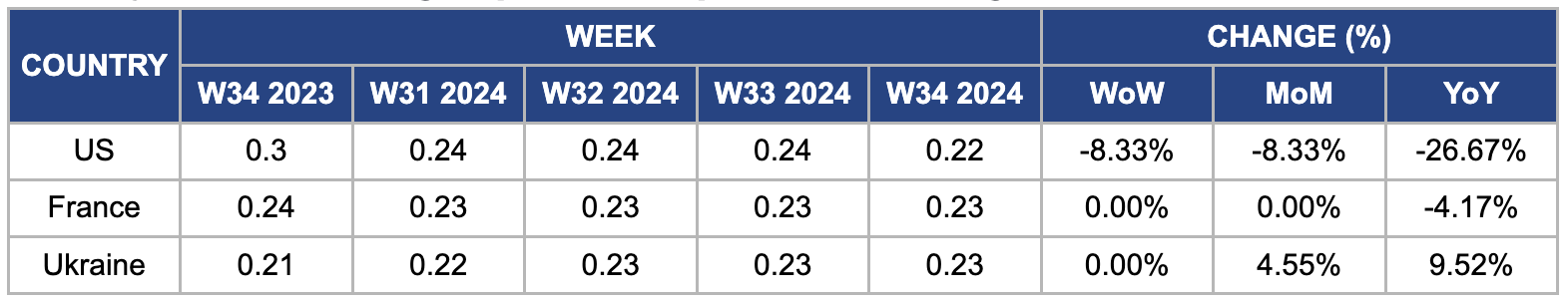 In W34, French wheat prices held steady at USD 0.23/kg over the past month but fell by 4.17% YoY. The decline is due to weak export demand, particularly from Egypt, and increased competition from Black Sea suppliers like Russia. This drop follows an initial price increase triggered by a Russian missile attack on a Ukrainian grain port, which raised concerns about potential disruptions to Ukrainian grain exports.