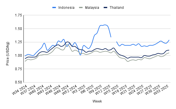 Thailand’s palm oil prices rose by 0.92% WoW to USD 1.10/kg in W34, rising 17.02% YoY, driven by tightening supply amid declining production. Annual output has decreased 3–4% since 2025 due to climate shocks, labor shortages, and competition from alternative oils, creating market deficits. These supply constraints are expected to sustain near-term price support, while improvements in labor availability or favorable weather conditions could ease pressures and moderate future price growth.