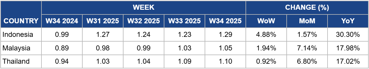 Malaysia's palm oil prices rose 1.94% WoW to USD 1.05/kg in W34, up 17.98% YoY from USD 0.89/kg in W34 2024, supported by firm biodiesel-driven demand and tightening soybean oil availability. With CPO at USD 1092.87/mt (MYR 4,607/mt), the Malaysian Palm Oil Council (MPOC) expects prices to remain above USD 1020.05/mt (MYR 4,300/mt) in the near term, though future stability hinges on competitiveness against soybean oil in the export market. Declining US and Brazilian soybean oil exports, and Indonesia’s potential B50 mandate in 2026, are set to tighten global vegetable oil supply further, lending continued support to palm oil. In the months ahead, limited stock build-up in Malaysia alongside steady demand from India and Africa is likely to sustain firm price momentum.