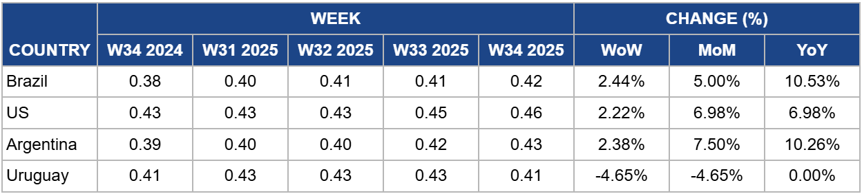 In W34, Uruguayan soybean prices decreased to USD 0.41/kg, a 4.65% drop WoW and MoM. Annually, prices remained unchanged. The price decline in Uruguay, contrasting with the increases in neighboring Brazil and Argentina, can be attributed to localized factors such as the timing of farmer sales and export loading schedules. With a significant portion of the harvest already sold, the remaining supply is subject to more volatile price movements based on immediate logistical needs and buyer interest. The completion of major export programs for the season has likely led to a temporary drop in demand at the port, pressuring prices downward.