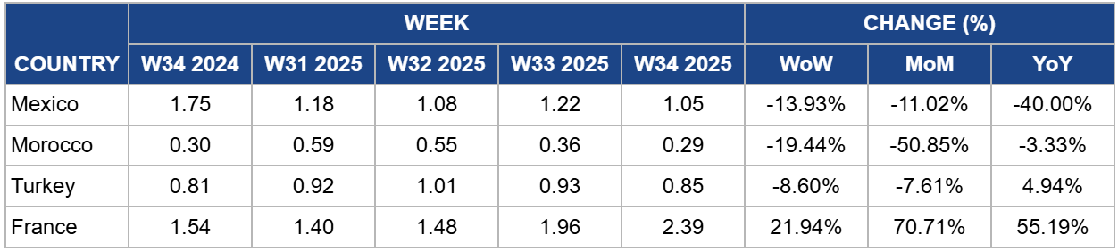 With French tomato production impacted by extreme heat and prices surging over 55% YoY, European buyers must urgently diversify their sourcing. Morocco, which has already increased its exports to Spain by 34% YoY, offers the most immediate and cost-effective alternative due to geographical proximity and low prices at USD 0.29/kg in W34. Buyers should also secure contracts with Turkish suppliers to hedge against further regional weather disruptions and ensure a stable supply chain through the fall.