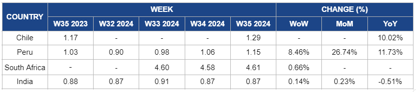 In Peru, grape prices continue to increase, rising 8.46% week-on-week (WoW) to USD 1.15/kg in W34, compared to the previous price of USD 1.06/kg. There is also a 26.74% month-on-month (MoM) and 11.73% YoY increase. This upward trend is driven by Peru's dominant position as the world's leading grape exporter, with significant annual growth in export volumes. Despite global stagnation in the grape trade and increased competition from countries like China and India, Peru's extended growing season and strong export demand allow it to maintain and potentially raise prices. The robust export performance and high global demand have led to higher prices domestically and abroad.