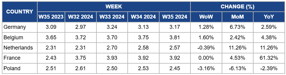 In W35, Belgium’s powdered whole milk prices increased by 1.6% WoW to USD 3.81/kg from USD 3.75/kg in W34, marking the fourth consecutive week of price increases, driven by overall global market trends. The country’s dairy cattle population has declined since 2023 due to high feed and low milk prices. Despite this, the country’s milk yield has increased due to genetic livestock improvements and sustainable business practices. In addition, the country’s organic sector is also experiencing growth due to high demand.