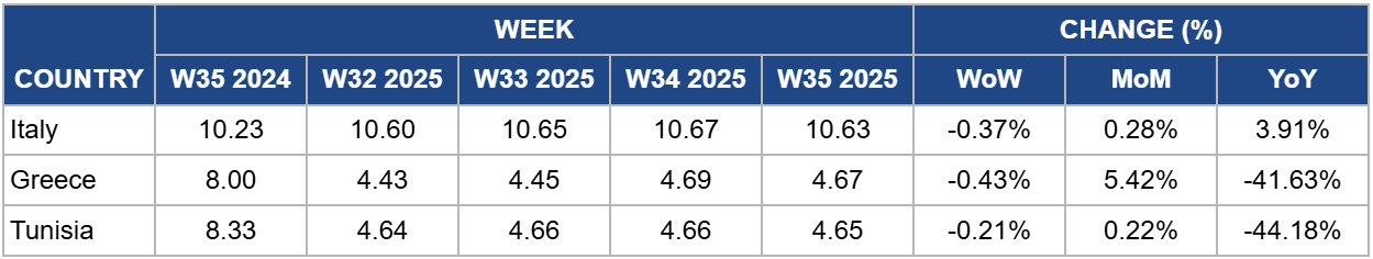 In Greece, the price of extra virgin olive oil was USD 4.67/kg in W35, down 0.43% WoW and 41.63% YoY. However, it rose 5.42% MoM. The slight WoW decrease suggests that the recent end-of-season price rally has peaked as trading activity subsides due to the near-total depletion of available high-quality stocks. The strong MoM increase, however, still reflects the significant upward price pressure seen in late August, driven by a classic supply squeeze where strong demand from buyers, particularly in Italy, competed for the last remaining volumes. The massive 41.63% YoY price collapse remains the long-term trend. This is a direct consequence of the strong production rebound during the 2024/25 season, which ended the severe scarcity and record-high prices of the previous year.