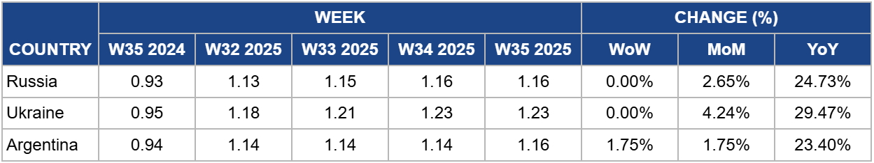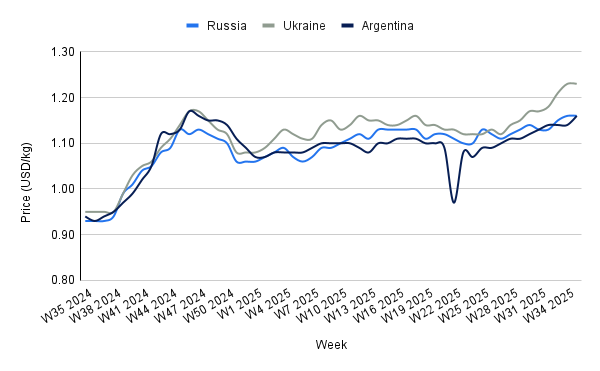 Russia's sunflower oil prices held steady at USD 1.16/kg in W35, showing no week-on-week (WoW) change but rising 24.73% year-on-year (YoY), supported by strong demand despite expectations of record harvests. Forecasts project sunflower output at 18.2–19.5 million metric tons (mmt), lifting overall oilseed production above 33 mmt and raising sunflower oil production potential to over 10.5 mmt. With export capacity estimated at 5.2 mmt, an abundant supply is likely to heighten competition in global markets. While stable prices reflect current demand, analysts warn that record harvests, increased processing, and growing export availability could create downward pressure in the coming months, particularly as seasonal supplies from the EU and Ukraine also expand.