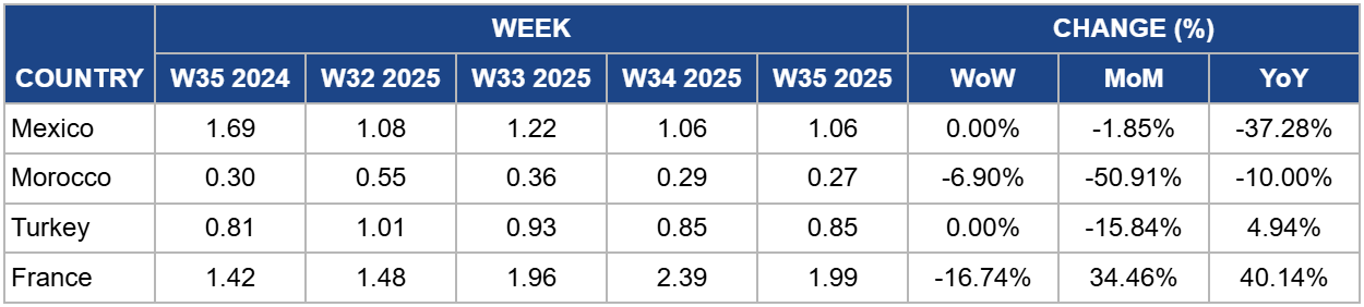 In W35, the wholesale price for Moroccan tomatoes decreased by 6.90% WoW settling at USD 0.27/kg. This continues a steep (MoM) correction of 50.91%, with the price also dropping 10% below last year's level. The sharp MoM slide reflects ample availability and an aggressive export tempo into the European Union (EU). This is particularly evident in Spain, where Moroccan shipments surged in early 2025, reinforcing Morocco's role as a key off-season supplier to the European market.Strong flows help satisfy elevated EU demand but simultaneously pressure origin‑side wholesale quotes when volumes move quickly through the chain. At the same time, continued sector resilience despite years of drought has enabled exporters to keep filling European gaps, even as European producer groups intensify pushback against Moroccan competitive pressure, an ongoing policy risk to watch for pricing ahead.