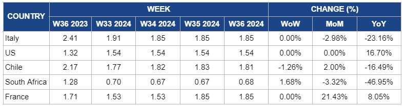 In W36, apple prices in Italy remained steady at USD 1.85/kg, consistent with the price in W34. However, there is a 2.98% month-on-month (MoM) decrease and a 23.16% YoY decrease. The MoM decline reflects the ongoing stability of supply and demand dynamics, supported by the VOG Consortium's consistent availability and reduced competition in European markets. The YoY decrease is attributed to the robust performance of the previous season and increased availability from the new harvest this season, which has alleviated market pressure and contributed to the lower price comparison YoY.