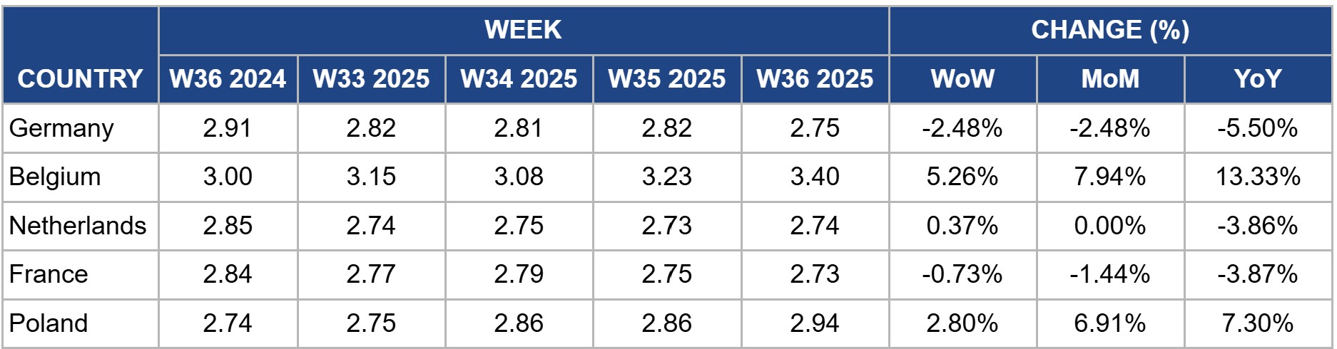 In the Netherlands, the price of SMP was USD 2.74/kg in W36, a slight increase of 0.37% WoW, but flat MoM and down 3.86% YoY. The Dutch market remains stagnant, showing neither the sharp decline seen in Germany nor the surge in Belgium. The modest WoW uptick suggests a minimal return of demand, but the flat MoM figure indicates a lack of any real upward momentum. The market appears to be caught between conflicting forces: a tightening domestic milk supply is providing some price support, but this is being effectively neutralized by the weak international outlook, confirmed by the recent poor Global Dairy Trade (GDT) auction results, and intense competition among domestic processors.