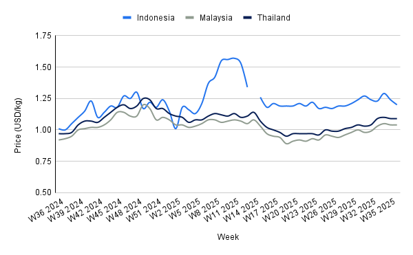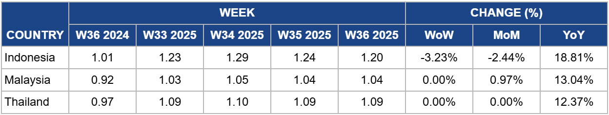 In W36, Malaysia’s palm oil prices held steady at USD 1.04/kg, unchanged WoW but higher 13.04% YoY from USD 0.92/kg. Futures on the Bursa Malaysia Derivatives Exchange (MDEX) gained 0.86% to USD 1065.15/mt (MYR 4,480/mt), supported by expectations of strong Sep-25 export demand, though inventories are forecast to rise for a sixth consecutive month as production outpaces shipments. This suggests near-term price stability, with possible downside risk if stock levels continue building. However, support comes from firm demand in key destinations and movements in rival edible oils, with soyoil futures in both the Dalian Commodity Exchange (DCE) and Chicago Mercantile Exchange (CME) edging higher. A weaker ringgit also enhances Malaysia’s export competitiveness. The balance between export momentum and production trends will be decisive, while weaker crude oil prices may temper biodiesel-linked demand, potentially capping future price gains.