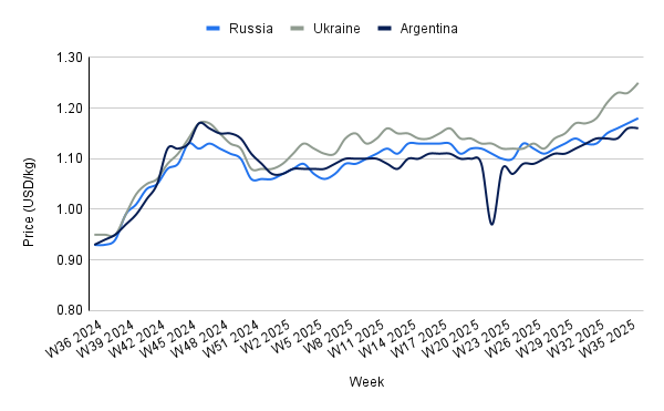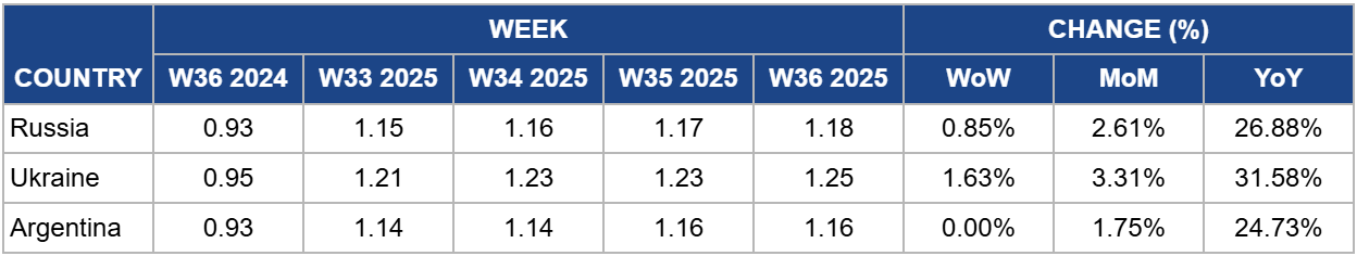 In W36, Russia’s sunflower oil prices rose 0.85% week-on-week (WoW) to USD 1.18 per kilogram (kg), marking a 26.88% increase YoY from USD 0.93/kg. Despite broader crisis trends in Russian agriculture, the oilseeds sector remains relatively stable, though MY 2024/25 saw a decline in sunflower oil production and exports by 11% amid margin pressures. A record sunflower harvest of 17.8–18 mmt is expected, which, combined with rising demand, could support further price stability or moderate growth. However, low carryover stocks and risks from drought and uncertain weather may sustain market volatility, potentially keeping prices elevated in the short term while positioning sunflower oil as a leading export segment in Russia.