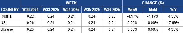 In W36, Russia’s wheat prices fell 4.17% week-on-week (WoW) and month-on-month (MoM) to USD 0.23/kg, influenced by expectations of a higher 2025/26 output of 85.4 mmt and exports projected at 43 mmt. Active deliveries of the new crop and sluggish export purchases have prompted exporters to cut prices amid weak import demand and the arrival of the new harvest. Ongoing difficulties with ship passage, which delayed most Aug-25 deliveries until Sep-25, have further reduced exporters’ willingness to offer new sales. The recent spike in export duties to USD 1.59/mt (RUB 134.4/mt) on September 3, 4.2 times higher than the previous week, has also likely dampened demand. Competition from upcoming Argentine and Australian harvests, estimated at over 20 mmt and 33.8 mmt respectively, adds further pressure. Despite these declines, prices remain 4.55% higher YoY.