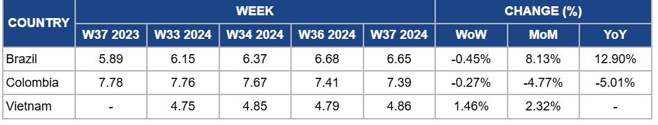 In W37 2024, Vietnam’s coffee prices increased by 1.46% WoW to USD 4.86/kg, following a 2.32% MoM rise. The country’s coffee production faces challenges from climate change, resulting in lower output and inventory levels. Consequently, Vietnam's coffee exports fell by 1% MoM in Aug-24. Although the country’s 2024/25 coffee harvest will begin in Oct-24, which is expected to improve supply, prices have remained high due to crop losses from dry weather at the beginning of the season. Similar production challenges in Brazil suggest that coffee prices will continue their upward trend globally.