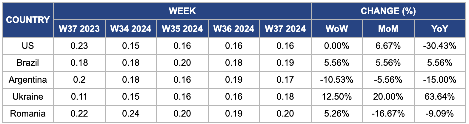 In W37, Romanian maize wholesale prices rose by 5.26% WoW to USD 0.20/kg. As Europe's second-largest grain exporter after France, Romania is facing a significant drop in corn harvests due to one of the worst droughts in recent decades, affecting nearly 2 million ha of farmland. Corn output is expected to decline 10 to 15% in the upcoming Oct-24 to Sept-25 season, leading to concerns over tighter supply conditions.